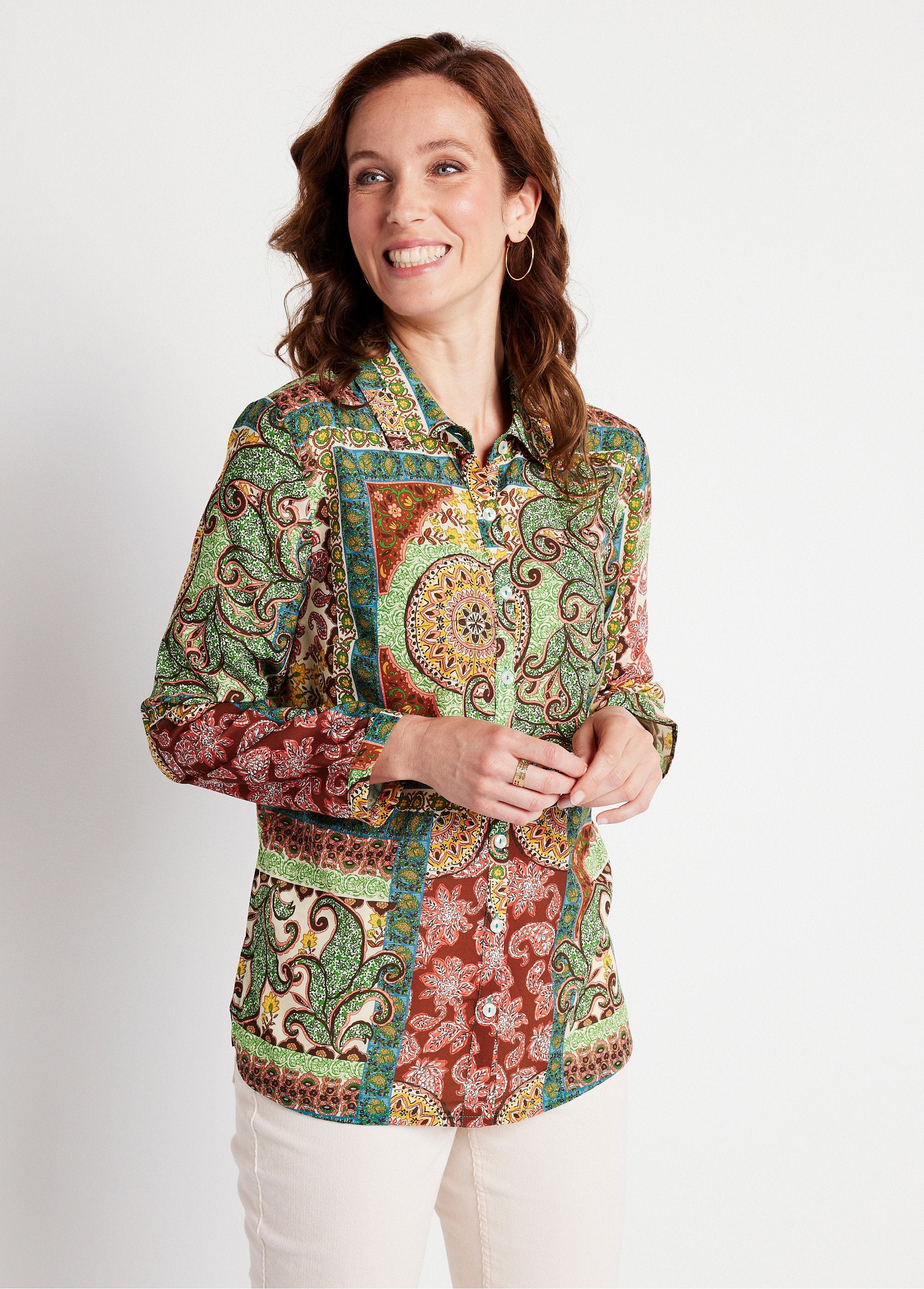 With its trendy scarf print, the blouse delivers in terms of style! Pointed collar on collar stand. Placket. Long sleeves tightened into a bracelet. Straight base. Topstitched finishes.