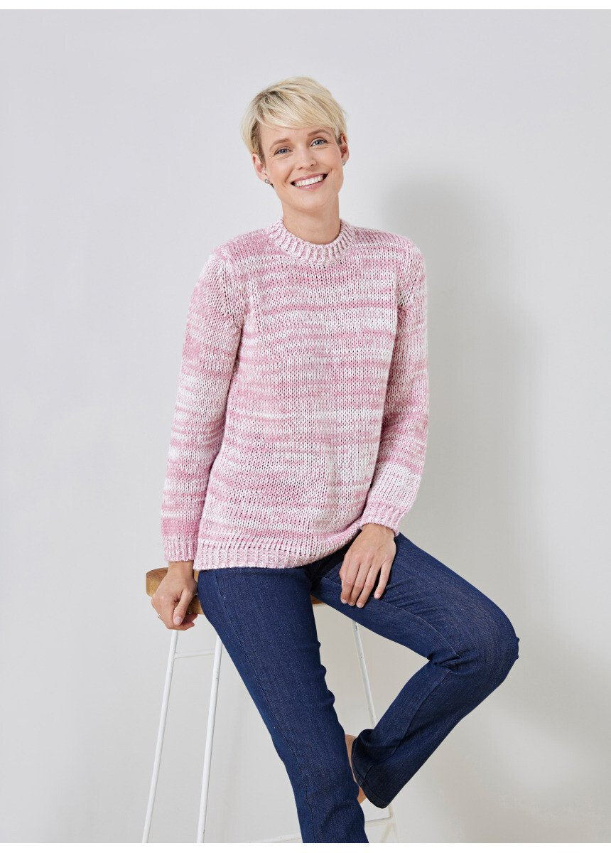 Softness and comfort with the thick mottled knit sweater. Ribbed finishes at the round neckline, at the bottom of the long sleeves and at the base.