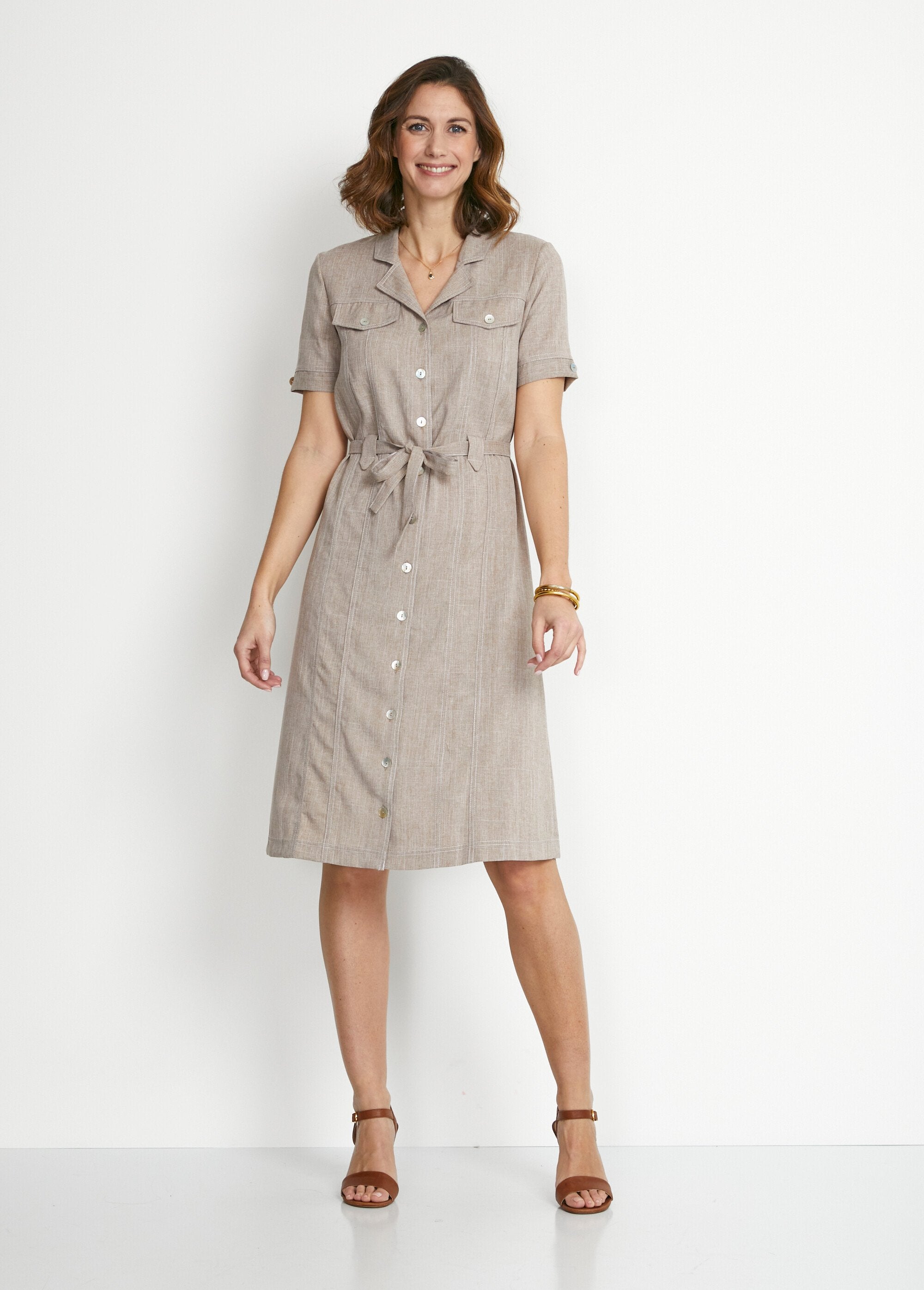 The perfect shirt dress for an elegant and casual everyday life. Fully buttoned line, structured by sets of yokes and cutouts at the front. Notched collar. Buttoned chest flaps, pocket effect. Same fabric belt to tie under fancy loops. Yoke with fancy button at the bottom of the short sleeves. Stitched finishes.