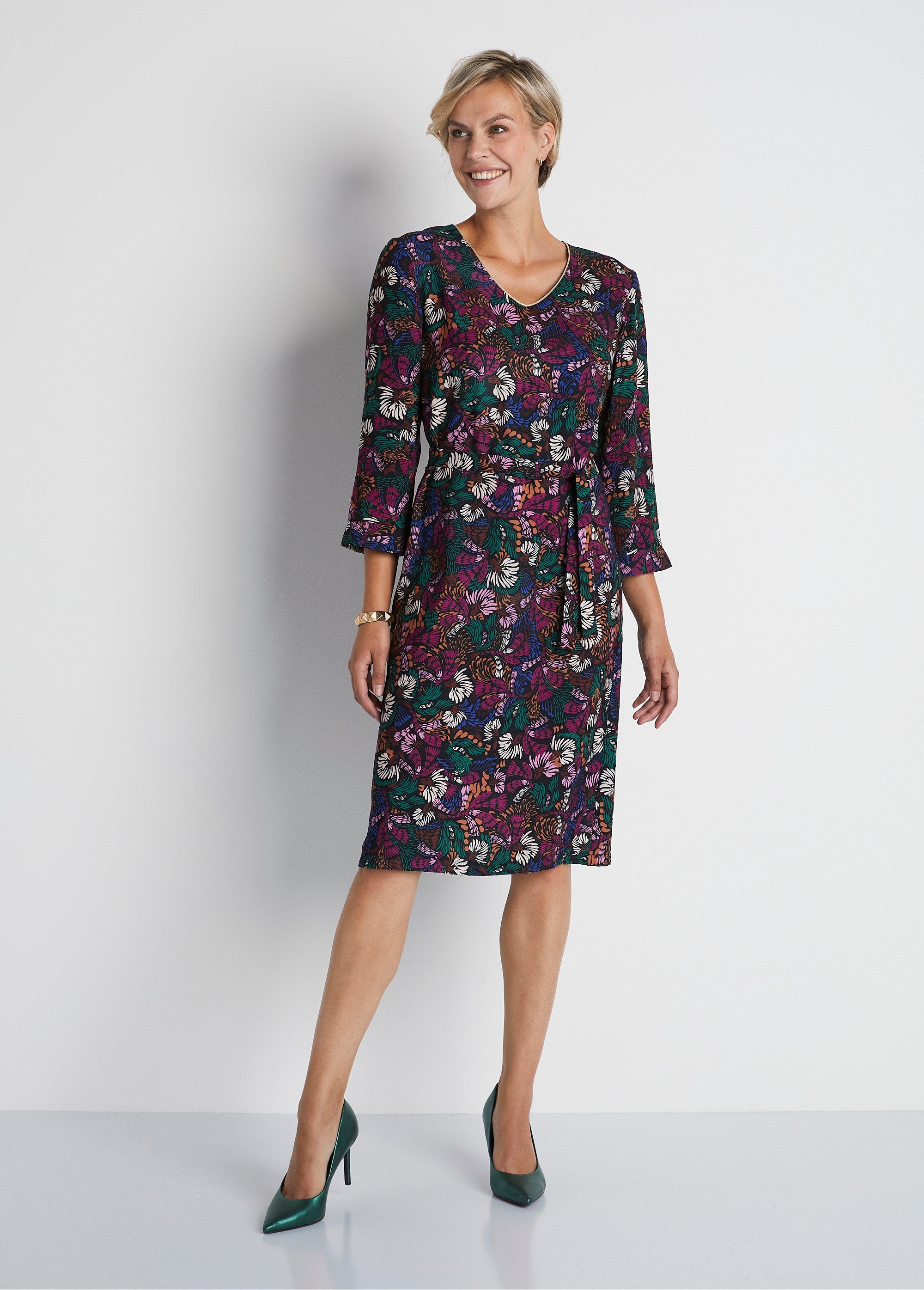 Synonymous with style and comfort, the cover dress features a colorful print, between graphic and plant-based. Gold colored bias at the V-neck at the front, bias at the back neckline. 3/4 sleeves with split bracelets. Removable belt in the same material to tie under loops. French made.