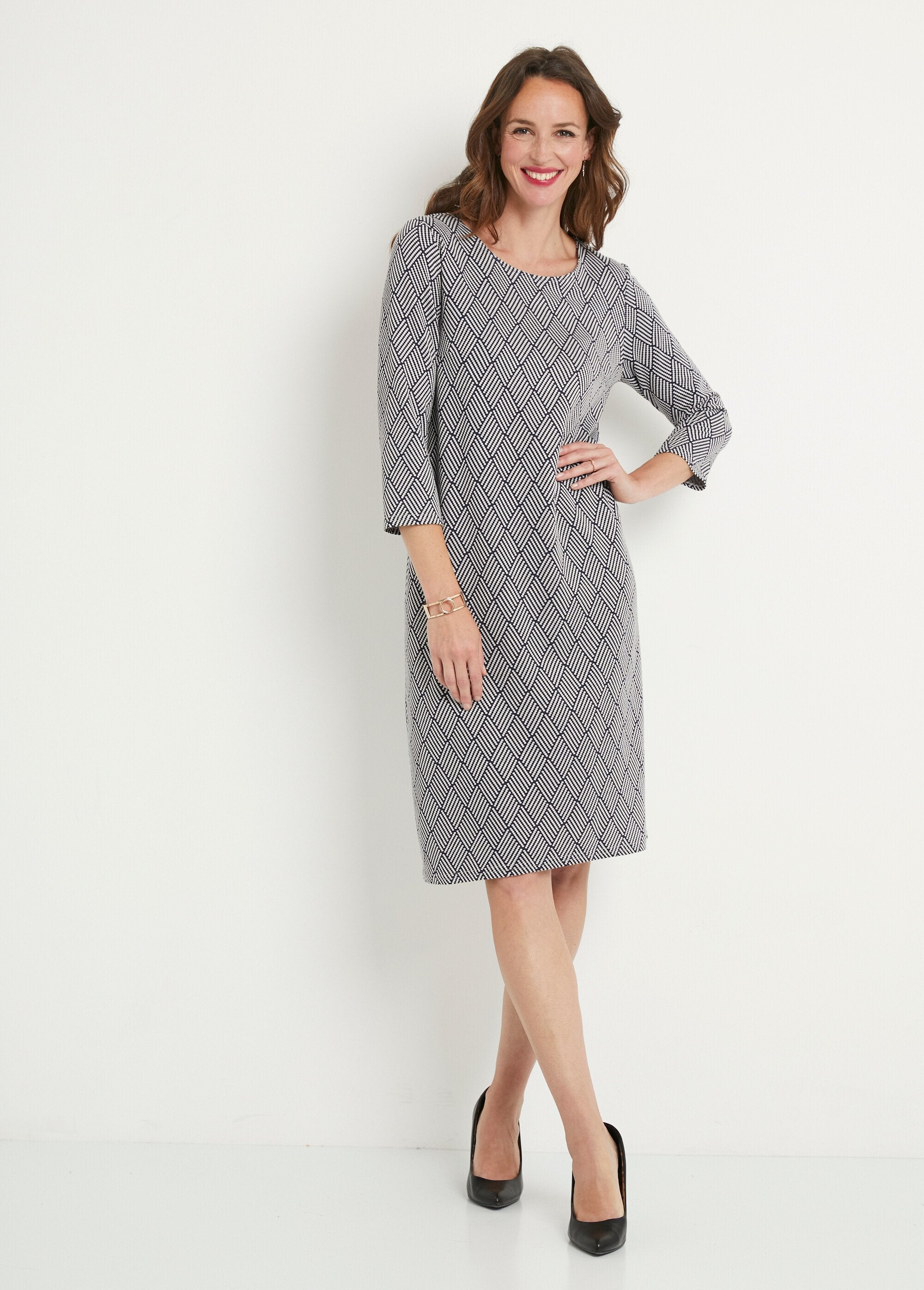 Short straight graphic jacquard dress  Navy and ecru