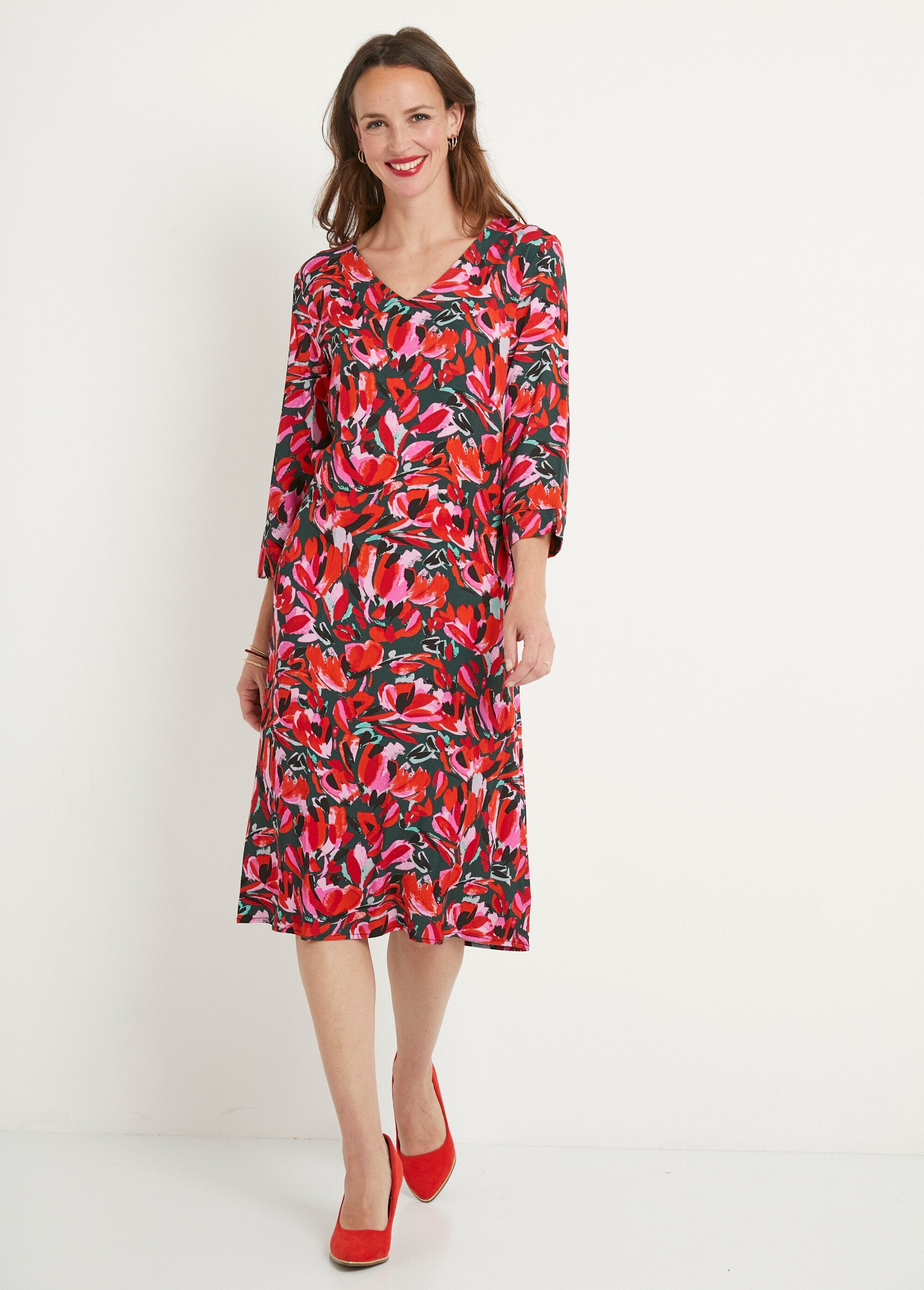 Elegant floral print, luminous hues, supple, flowing fabric... This feminine, easy-cut dress features a straight cut, beautiful V-neckline and 3/4 sleeves. Inner collar at V-neck, bias at back neckline.